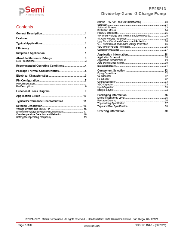 The PE25213 supports a 5.7V to 15V input voltage range in divide-by-2 mode and 8.4V to 15V in divideby-3 mode.