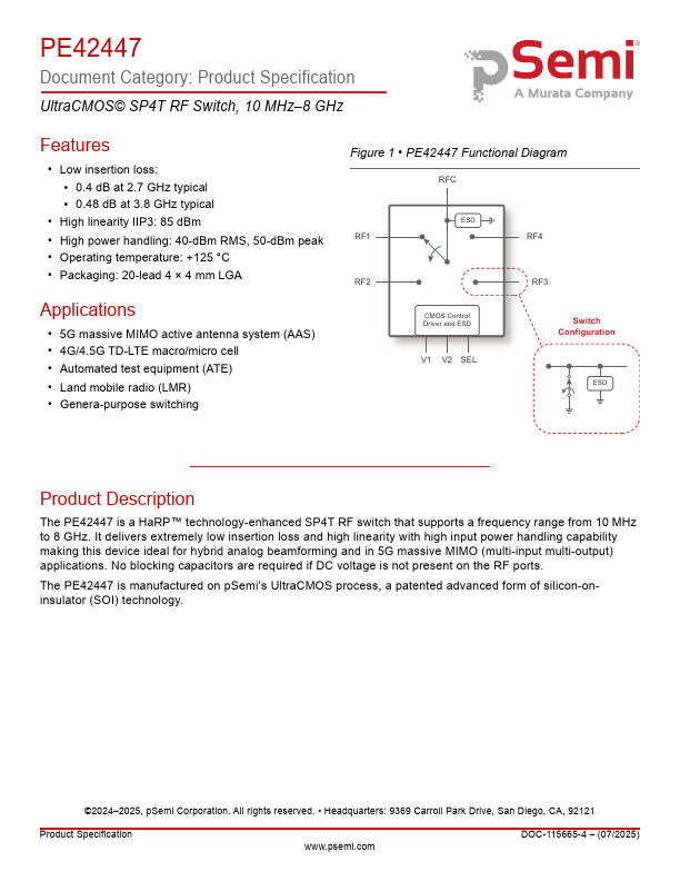 The PE42447 is a HaRP™ technology-enhanced SP4T RF switch that supports a frequency range from 10 MHz to 8 GHz.