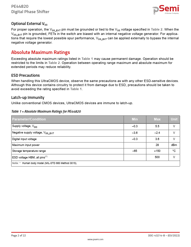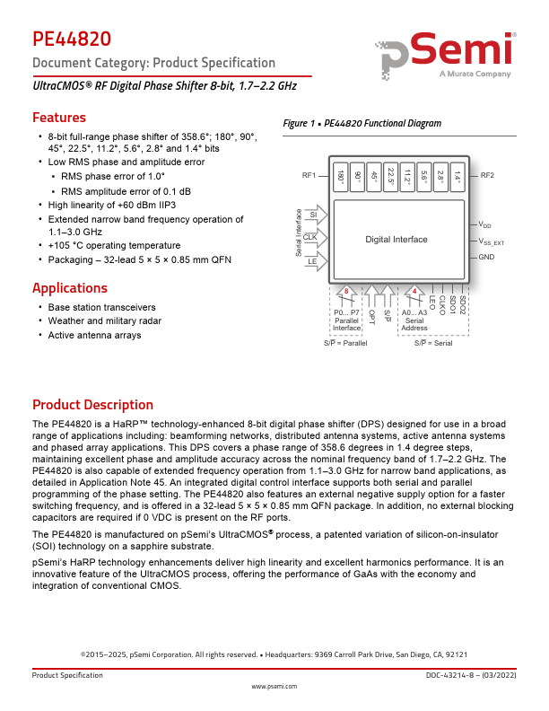 UltraCMOS® RF Digital Phase Shifter 8-bit, 1.7–2.2 GHz
